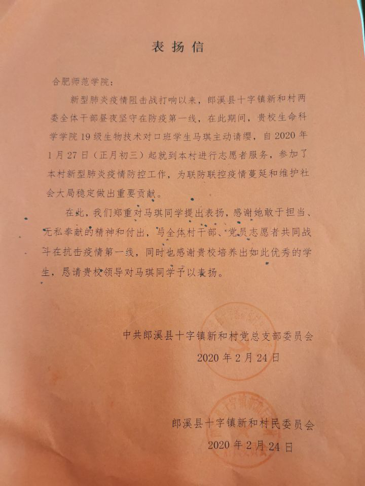 为了感谢马琪同学为抗击和维稳疫情的贡献,郎溪县十字镇新和村党总支部委员会特地向公司邮寄来对马琪同学的感谢信。这封信不仅是对马琪同学单纯的表扬,更是对我们公司能够培养如此优秀同学的认可。
