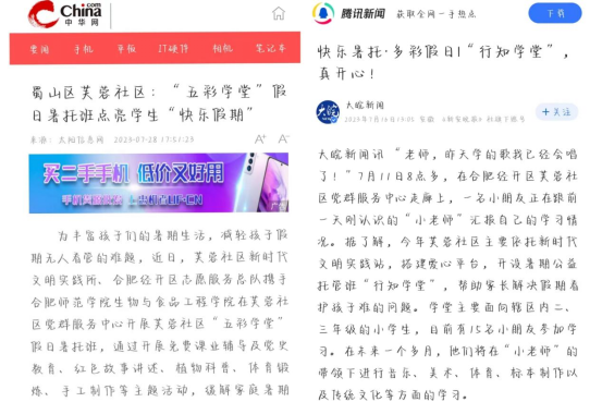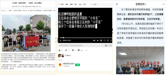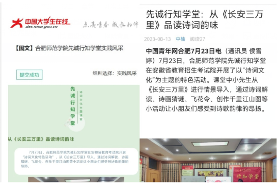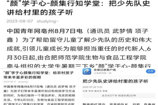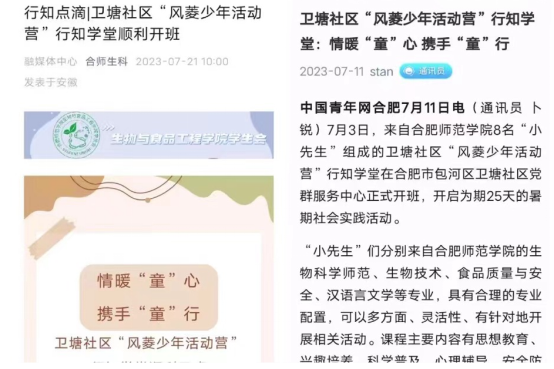 芙蓉社区行知学堂获《中华网》《中青校园》《腾讯新闻》等媒体相继报道17次;谯城区颜集镇李集村“颜”学于心-颜集行知学堂获《中青网》《安徽日报》《安徽检察》等媒体相继报道13次;卫塘社区“风菱少年活动营”行知学堂获《中青校园》《和美望湖》等10家媒体相继报道;阜阳王庄行知学堂获《中青校园》《颍东区共青团》等6家媒体相继报道;先诚行知学堂获《中青校园》《中国老员工在线》等5家媒体相继报道。