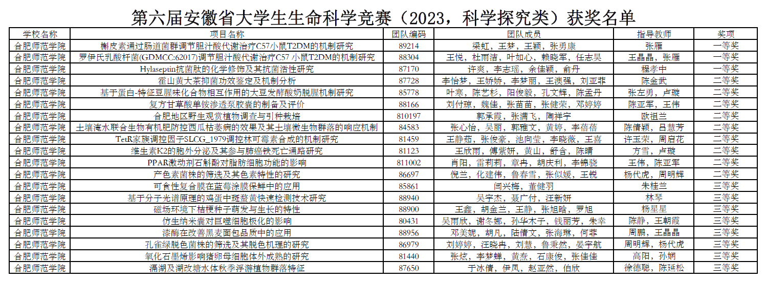 张雁老师指导的《基槲皮素通过肠道菌群调节胆汁酸代谢治疗C57小鼠T2DM的机制研究》(团队成员:梁虹、王梦、王颖、张勇康),王晶晶和张雁老师指导的《罗伊氏乳酸杆菌(GDMCC:62017)调节胆汁酸代谢治疗C57小鼠T2DM的机制研究》(团队成员:王悦、杜雨洁、叶如心、赖晓军、任志昊),程孝中老师指导的《Hylaseptin抗菌肽的化学修饰及其抗菌活性研究》(团队成员:许爽、李志瑶、余佳颖、俞丹)3个项目荣获省级一等奖。另外有9个项目获省级二等奖,8个项目获省级三等奖。