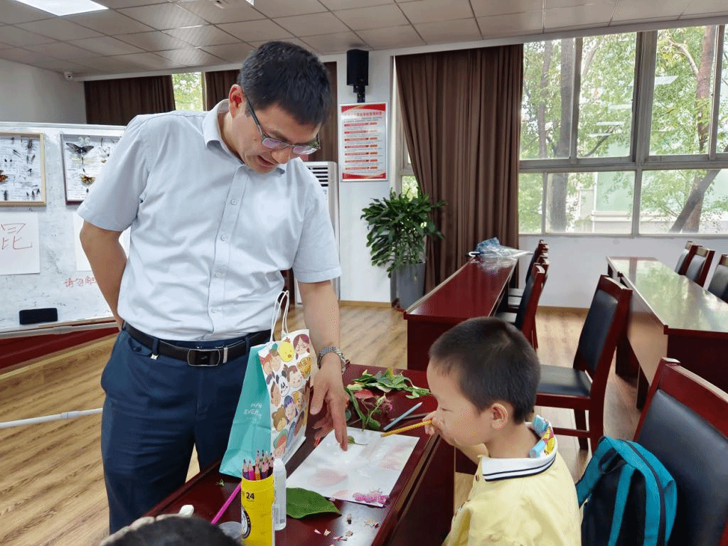 在学堂开课前,周端明带领小学员们欣赏小先生带去的动物标本,教小学员们认识昆虫。接着,周端明一行饶有兴致地观摩了小先生的课堂教学,小先生们结合自己的专业特色带领小学员们制作植物标本,在制作过程中,周端明一行与小学员们热情互动,观看小学员的作品,对小学员们的创新思维给予高度赞扬,并为小学员们发放了文具礼品,鼓励小学员们好好学习,天天向上,小学员们开心表达谢意。