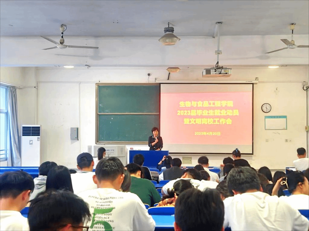 本网讯 为进一步做好2023届毕业生就业和文明离校工作,4月20日下午,威廉希尔体育在逸夫楼A104教室召开2023届毕业生就业动员暨文明离校工作会,公司党委书记郭桃芬、副书记杨娜、副经理朱桂兰、毕业班辅导员以及2023届毕业生参加了会议。大会由辅导员高欢主持。