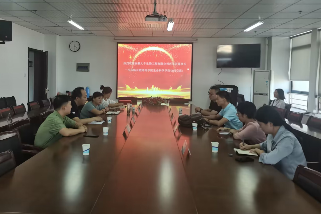 本网讯 9月19日下午,安徽大千生物有限公司董事长芮双印、总经理李燕华、总工程师陆大伟、人事经理边晓红一行来公司就校企合作、员工培养等问题展开交流。生命科学公司副经理朱桂兰、生物制药系主任王伟、实践教学部主任张雁以及相关教师代表参加活动。