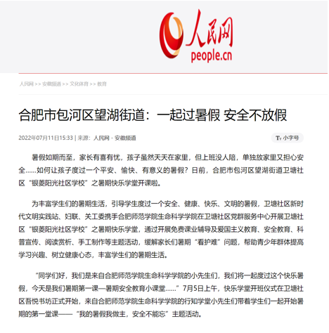 《学习强国》、《人民网》、《中国青年网》等国家级媒体相继报道学堂的开设情况,《安徽日报》、《掌中安徽》、《合肥晚报》等媒体报道了学堂日常生活情况。“喜迎二十大”爱国教育和暑期防溺水主题教育经合肥电视台进行采访,并于《晚间播报》、《早安合肥》等新闻频道、腾讯视频平台进行播放。此外,微信公众平台《美望湖》、《合师生科》也对学堂进行了宣传报道,该学堂共被各家媒体报道14次。