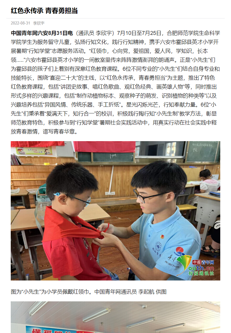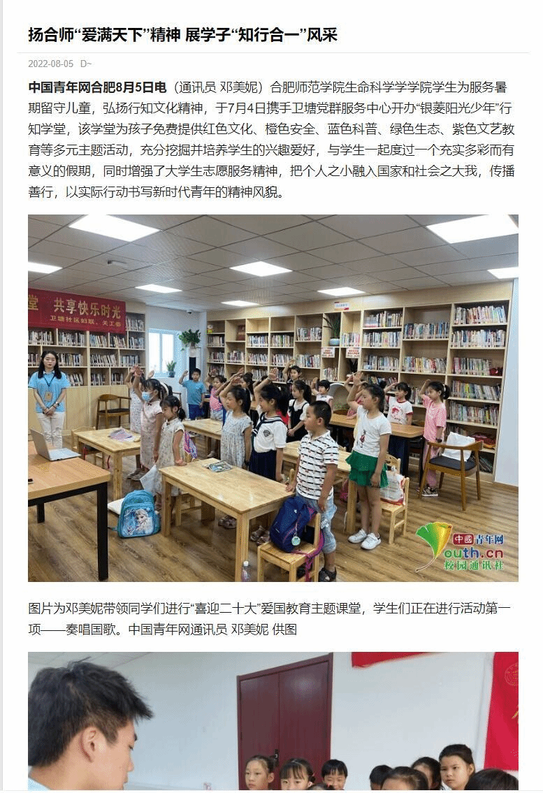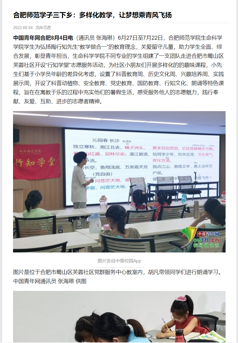 本网讯 为进一步发扬行知精神,弘扬行知文化,培养当代老员工社会责任感,生命科学公司积极动员员工参加“行知学堂”暑期实践活动,员工热情高涨。三个团队受到了《中国青年网》媒体的报道,其中包括卫塘社区“银菱阳光少年”行知学堂、合肥市蜀山区芙蓉社区行知学堂、六安霍邱县行知学堂。