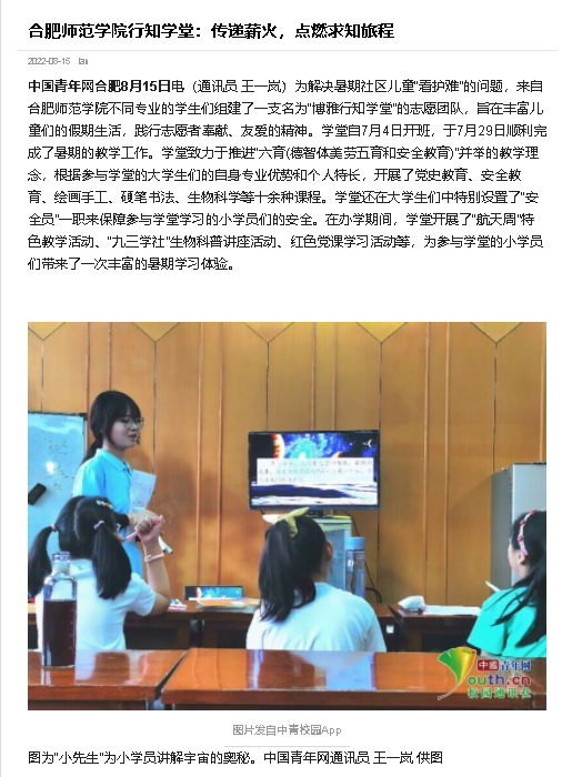 该学堂由公司赴省教育招生考试院挂职副教授王占军组建,并担任学堂指导教师。办学期间,开展了党史教育、安全教育、绘画手工、硬笔书法、生物科学等十余种课程,还开展了“航天周”特色教学活动、“九三学社”生物科普讲座活动、红色党课学习活动等,为参与学堂的小学员们带来了一次丰富的暑期学习体验。(生命科学公司)