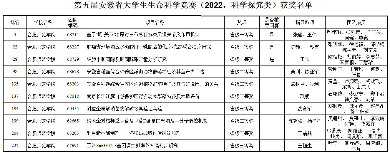 张雁、王伟老师指导的《基于“肠-关节”轴探讨白芍总苷抗类风湿关节炎作用机制》(团队成员:郝佳瑜、张勇康、任志吴、何璐、康鑫),陈静、王朝霞老师指导的《肿瘤微环境响应水凝胶用于乳腺癌的化疗—光热联合治疗研究》(团队成员:张进莘、徐德福、邹明娟、陈学奇、刘宁豪),王伟老师指导的《细胞中胆固醇及胆固醇酶定量分析》(团队成员:陈桂艳、胡丽婷、李志梦、李育鹏、丁慧珍)获省级一等奖。吴利、陈亚军老师指导的《安徽省稻渔综合种养区浮游动物群落特征及其鱼产力评估》获省级二等奖。欧祖兰、吴利老师指导的《安徽省稻渔综合种养区浮游植物群落特征及其与环境因子的关系》,耿明老师指导的《南京长江江豚自然保护区浮游动物群落特征及水质评价》,沈章军老师指导的《耐重金属解磷菌的解磷效果验证实验》,陈延松、杨星星老师指导的《纳米金对桔梗总皂苷及皂苷D含量的影响及其分子调控机制》,王晶晶老师指导的《利用新型酶制剂——漆酶Lac2取代传统添加剂》,王恒生老师指导的《玉米ZmGF14-3基因调控拟南芥株高初步研究》等6项分获省级三等奖。