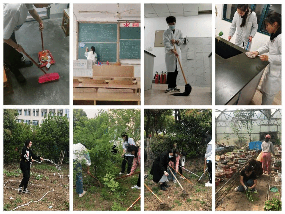 生科院本学期劳动教育区域覆盖教室、寝室、家庭、蓝莓中心、创业孵化基地、大棚等,内容包括打扫卫生、清理、摆放、锄地、拔草、植树、浇水、松土、育苗、栽种等,并观看了首届大国工匠创新交流大会。劳动过程中,同学们积极行动,分工有序,充分发扬了不怕苦、不怕脏、不怕累的精神,所打扫清理区域焕然一新,大棚、基地等苗木茂盛,他们的身影成为了校园角落里最靓丽的一道风景线。