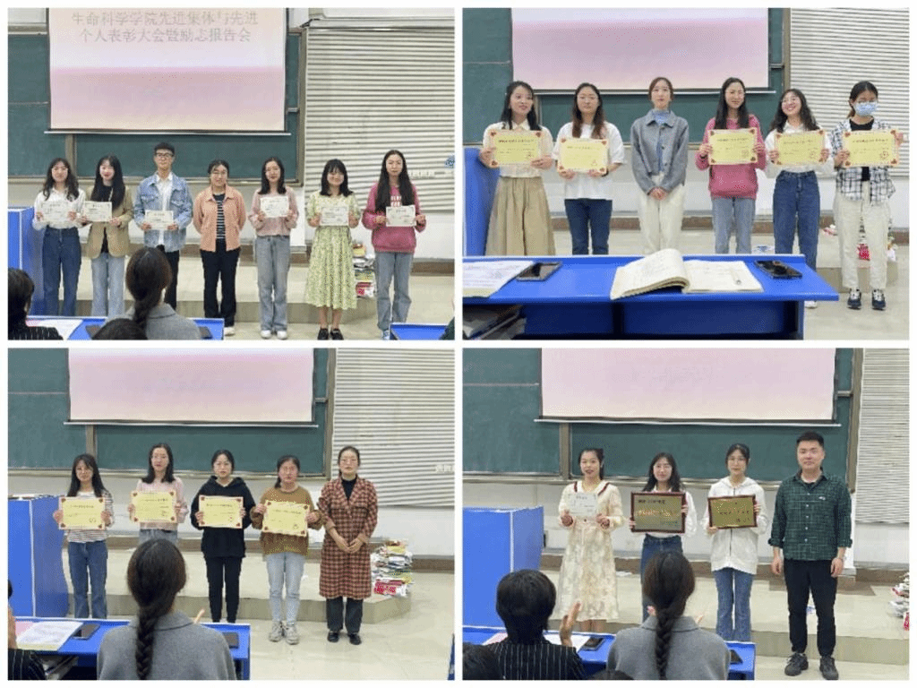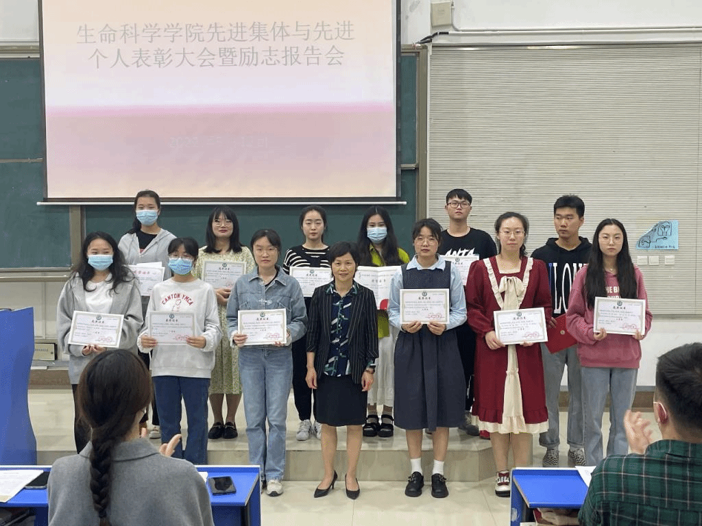 本网讯 为激发同学们创先争优意识,促进公司学风建设,5月12日中午,生命科学公司在锦绣校区逸夫楼西阶一教室举行先进个人和先进集体表彰大会暨优秀员工励志报告会。生命科学公司党委书记郭桃芬、辅导员高欢、杨帆、张瑜婷、梁悦,员工先进集体、先进个人代表和2021级全体员工参会。国家奖学金获得者张炀和卓凯丽、国家励志奖学金获得者吴琼三位优秀员工做励志报告。