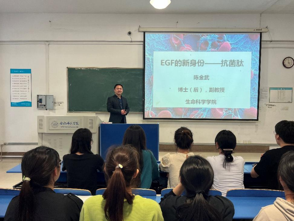 本网讯 2022年4月27日下午,生命科学公司副教授陈金武老师在锦绣校区逸夫楼103教室举行了“EGF的新身份—抗菌肽”学术报告,生科院2018级、2019级部分员工聆听了报告。