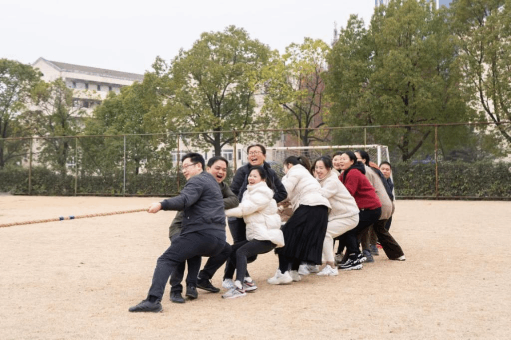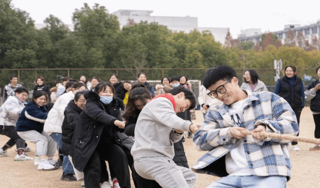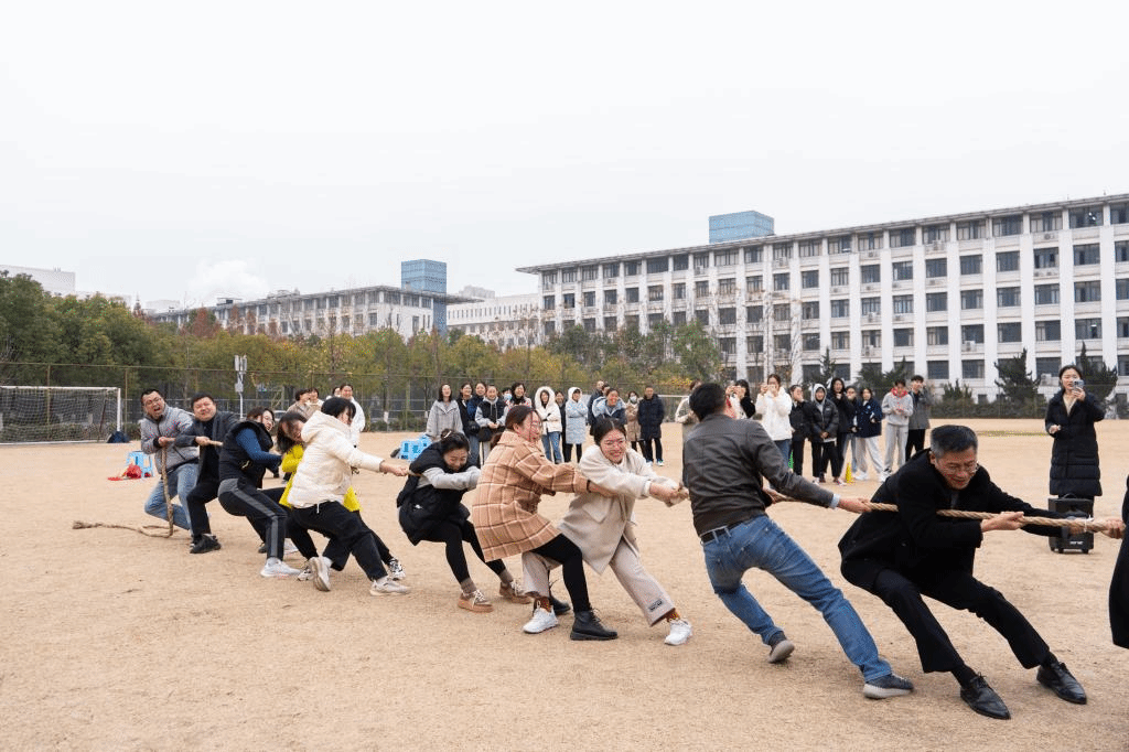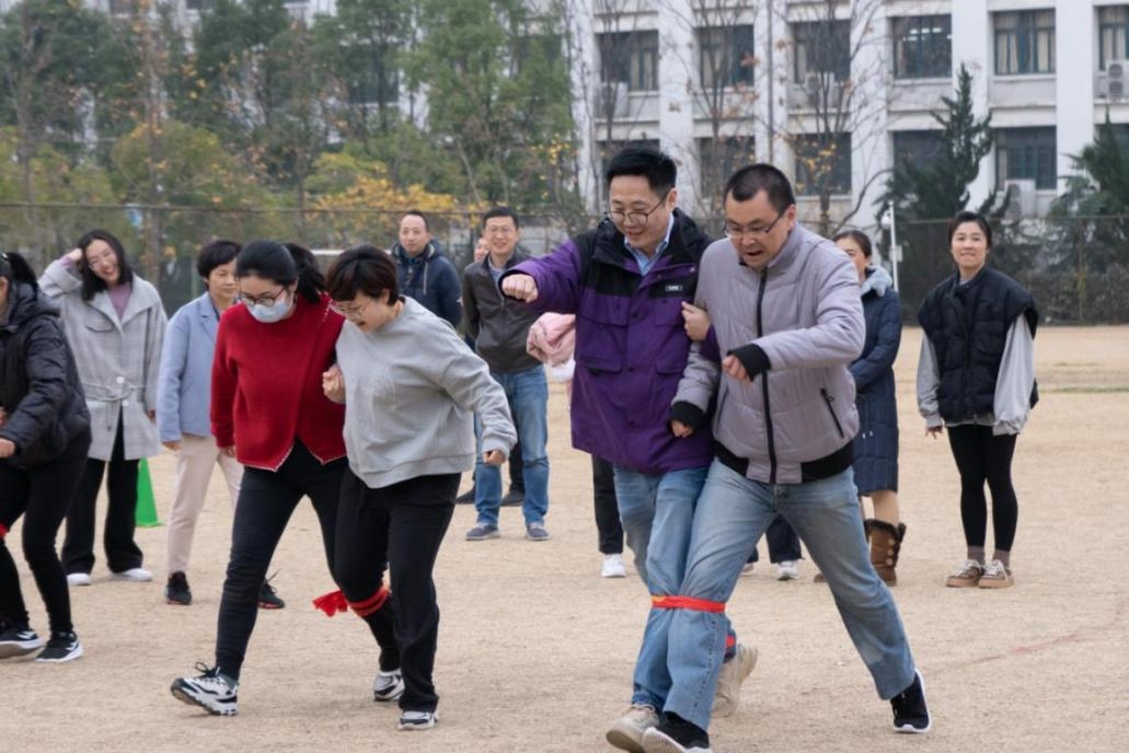 参加本次趣味运动会的为全体生科院教工和员工会干部,共设立四个比赛项目:拔河比赛、两人三足、抢板凳、背新娘。参赛队伍分别为生物技术教工队、食品质量与安全教工队、生物科学教工队、实验行政教工队和员工干部队。第一个比赛项目是拔河。当裁判哨声响起,参赛队员紧握长绳,拼尽全力向后拉,绳子中间的红飘带左右摇摆,在比赛进入胶着状态时,大家毫不退却,咬紧牙关,坚持到底。周围助威的师生热情高涨,恨不得亲自上场拉一把,加油声、呐喊声、欢笑声此起彼伏,现场气氛热烈、高潮不断,原本安静的操场瞬间沸腾起来。第二比赛项目是两人三足。一人左腿与另一人右腿的小腿用绳子绑上,每批次5支队伍,在观众们的加油欢呼声下,大家团结协作、争先恐后,一起奔跑到终点。第三比赛项目是抢板凳。每批次18人参加,大家随着欢快的音乐围着椅子转圈,音乐一停便开始争先抢坐在椅子上,一轮又一轮,气氛紧张又欢快。最终趣味运动会以背新娘为结尾,在师生的欢声笑语中拉下帷幕。