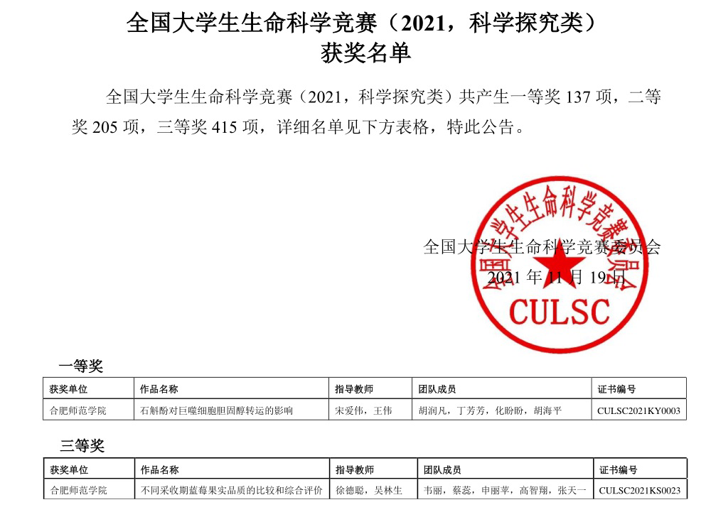本网讯 近日,2021年全国老员工生命科学竞赛决赛落下帷幕。经过网评、省赛和国赛三个环节,由公司王伟和宋爱伟老师指导,胡润凡、丁芳芳、化盼盼和胡海平同学参加的《石斛酚对巨噬细胞胆固醇转运的影响》荣获一等奖(科学探究类国赛最高奖项);由沈章军,徐德聪老师指导,杜荣荣、张帅、张舒畅、郑颜晨、高潇和季涛涛同学参加的《优创·荟民》荣获二等奖(创新创业类);由徐德聪,吴林生老师指导,韦丽、蔡蕊、申丽苹、高智翔和张天一同学参加的《不同采收期蓝莓果实品质的比较和综合评价》获得三等奖(科学探究类)。取得公司参加全国老员工生命科学竞赛以来历史最好成绩,生科学子再一次用知识和智慧交出了一份靓丽答卷。