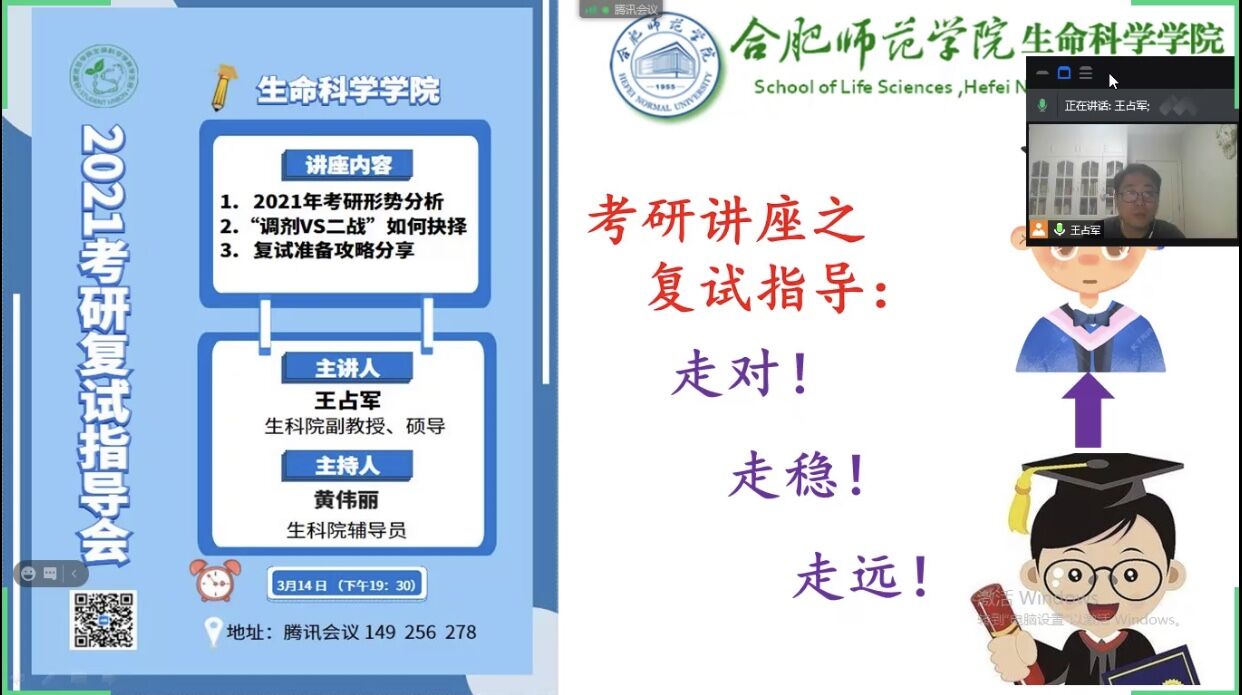 本网讯 为有效提高生命科学公司2021届本科毕业生研究生复试和调剂的成功率,精准把握复试备考过程中的方法和技巧,生命科学公司副教授、硕士生导师王占军主动作为,于3月14日晚19:30,利用腾讯会议App为生科院考研达线员工提供指导与帮助,充分发挥了党员教师的先锋模范作用。2017级辅导员黄伟丽组织考研员工参加指导交流会。
