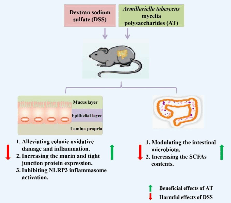 溃疡性结肠炎(UC)属于炎症性肠病(IBD)的一种,是一种病因尚不十分清楚的结肠和直肠慢性非特异性炎症性疾病。亮菌,又称假蜜环菌,其菌丝体中含有的多糖成分具有较好的抗炎作用。然而,亮菌菌丝体多糖(AT)对UC的影响尚未阐明。研究人员利用葡聚糖硫酸钠(DSS)建立UC小鼠模型,分别给予低、高剂量的AT进行灌胃干预。发现AT改善了UC小鼠的一般症状、减轻小鼠结肠的氧化应激和炎症反应。AT干预还可以改善UC小鼠结肠组织中紧密连接蛋白Claudin-1和occludin的表达,并上调结肠组织黏蛋白的表达,促进了结肠屏障功能的恢复。