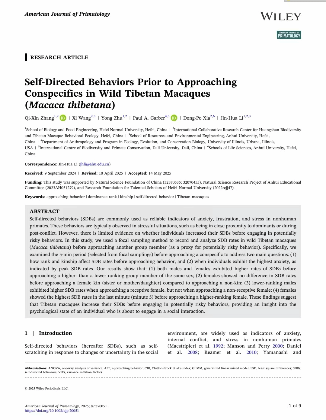 近日,威廉希尔体育李进华教授团队在《American Journal of Primatology》(中国科公司二区)在线发表了题为“Self-Directed Behaviors Prior to Approaching Conspecifics in Wild Tibetan Macaques (Macaca thibetana)”的科研论文,该研究为理解群居非人灵长类动物对社会关系认知提供新的参考。