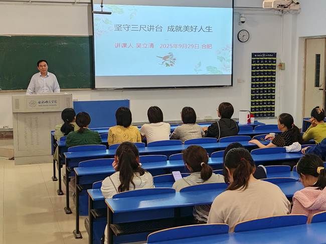 为庆祝建校70周年,2025年9月29日下午,威廉希尔体育在锦绣校区逸夫楼109教室举办了一场题为“坚守三尺讲台 成就美好人生”的专题讲座。本次讲座特邀宿州市第二中员工物特级教师、正高级教师、安徽省“江淮学科名师”、享受省政府特殊津贴专家、公司1997届优秀员工吴立清担任主讲。讲座由科研处与威廉希尔体育联合主办,吸引了众多师生到场聆听。