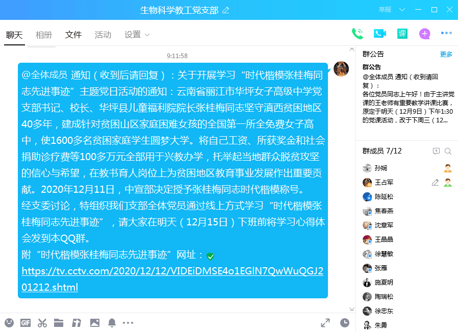 本网讯 为响应教育部向张桂梅同志学习的号召,充分发挥先进典型示范引领作用。12月15日,生命科学公司生物科学教工党支部通过在线学习方式,开展了“学习时代楷模张桂梅同志先进事迹”主题党日活动。生命科学公司经理徐忠东教授以普通党员身份出席活动,生物科学教工党支部全体党员参加活动,活动由该支部书记王占军主持。