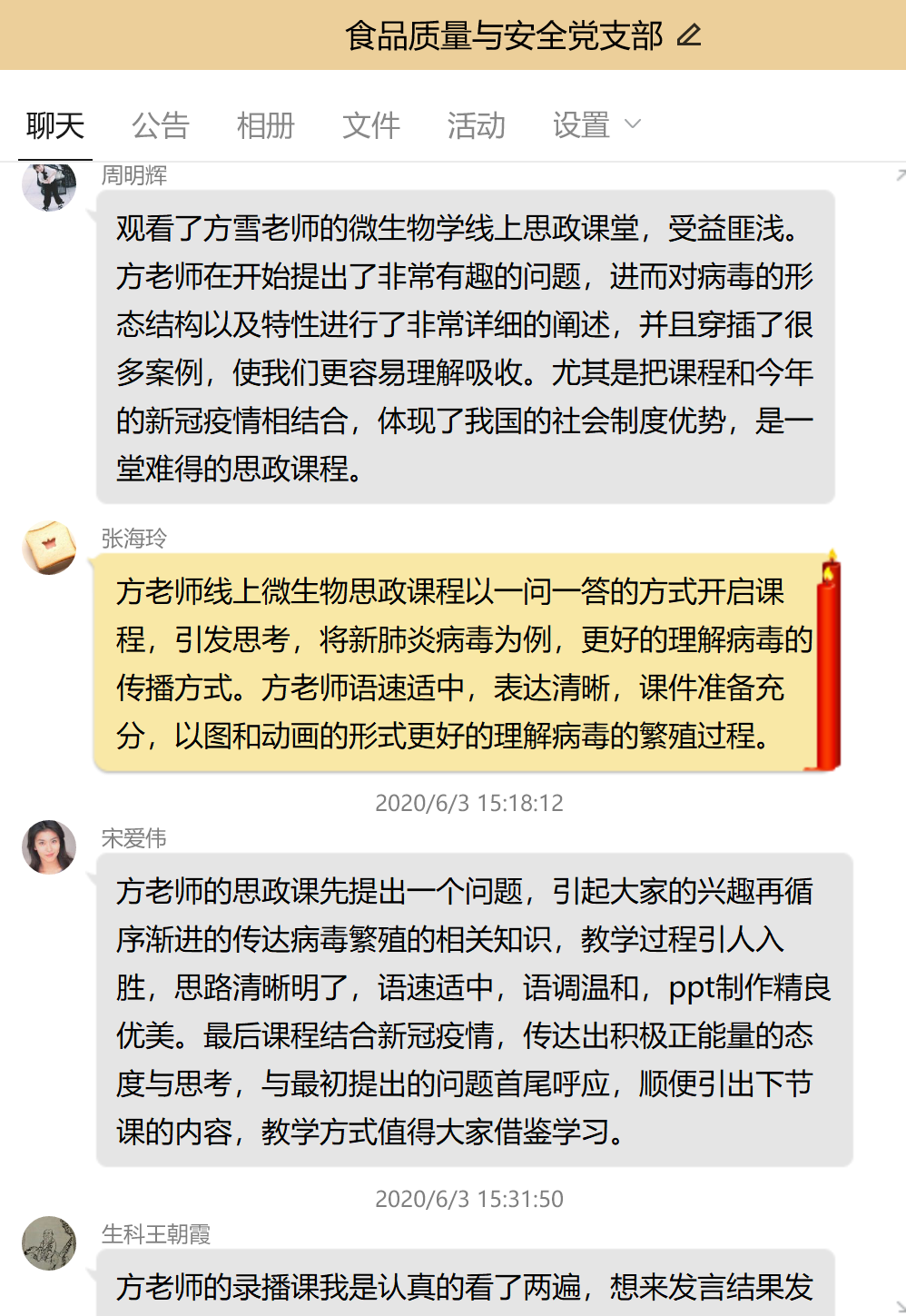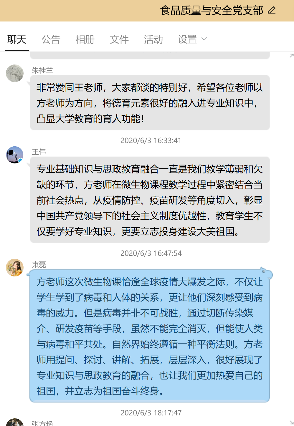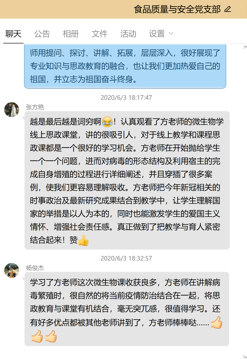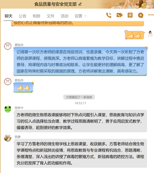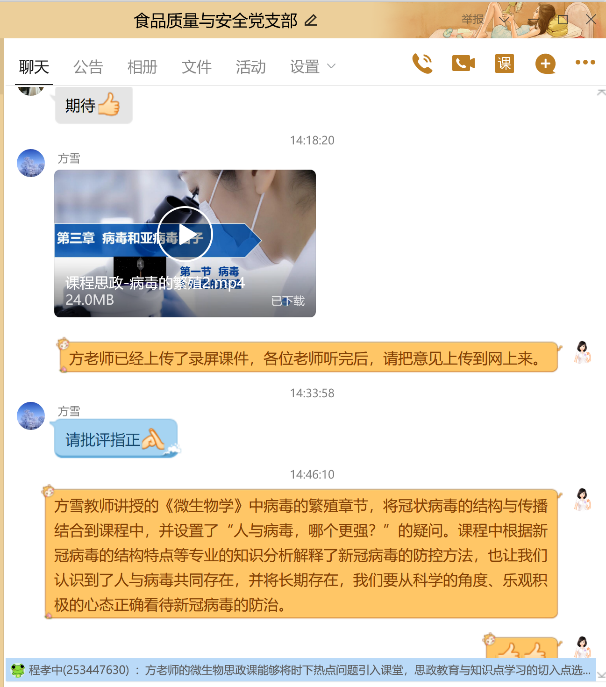 本网讯 6月3日下午,在食品质量与安全党支部邀请下,方雪同志根据微生物课程内容,在QQ平台上进行了一堂“课程思政”示范课。