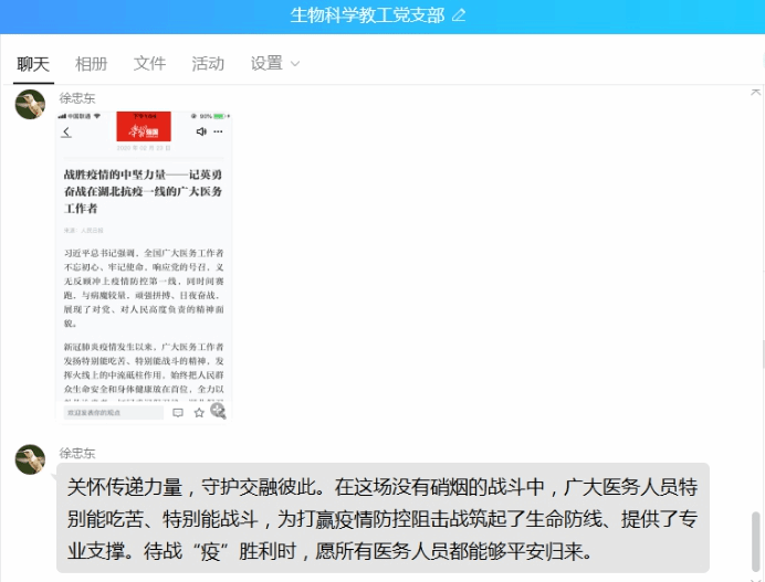 本网讯近期,新型冠状病毒感染肺炎疫情肆虐全国,在抗“疫”战场上,涌现出大批不畏牺牲、无私奉献、勇往直前的英雄事迹,感动着全国人民的心,激励着各族人民的斗志。2月23日,为学习抗“疫”英雄的先进事迹,生命科学公司生物科学教工党支部利用学习强国平台,开展了“学习抗疫英雄谱”主题党日活动,生命科学公司经理徐忠东以普通党员身份和支部全体党员教师一起积极参加了本次活动,活动由支部书记王占军组织。