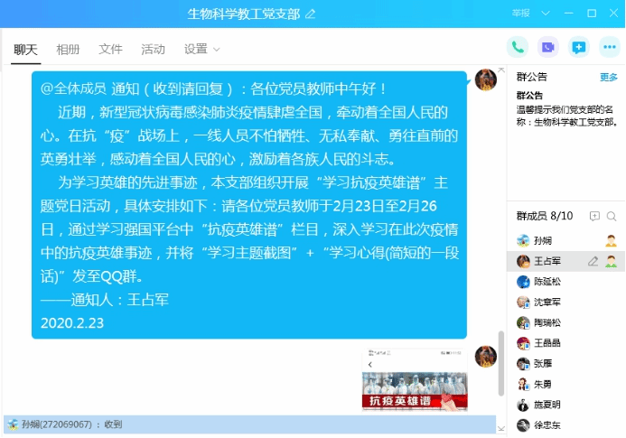 支部全体党员认真学习学习强国中的“抗疫英雄谱”,并积极分享了自己的学习心得:84岁仍然挂帅出征的钟南山院士,73岁力挽狂澜的李兰娟院士,冲锋在前的陈薇院士,武汉市武昌医院经理刘智明烈士,为抗击疫情推迟婚期的武汉市江夏区第一人民医院彭银华烈士,“硬核医生”复旦大学附属华山医院感染科主任张文宏医生,安徽医科大学附属巢湖医院ICU凌云护士长等一线的广大医务工作者们。