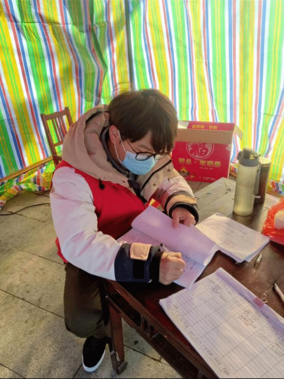 从疫情暴发到现在,李进同学时刻关注着此次的新冠肺炎疫情。每天早上醒来睁开眼睛就上网查看最新疫情进展,为那些不断增长的数字而揪心,为一直奋战在前线的医护工作者们而担忧。身为预备党员的他,怦然心动,想着要为国家和人民做点什么,正如上海医疗救治专家组组长张文宏所说,作为党员就应该冲在第一线,就应该起带头模范作用。张医生的话深深触动了他,让他萌生了参加志愿团队的想法,在家人的支持和鼓励下,李进主动申请加入安徽省六安市东河口镇的志愿活动,成为了牌楼村的一名老员工志愿者。