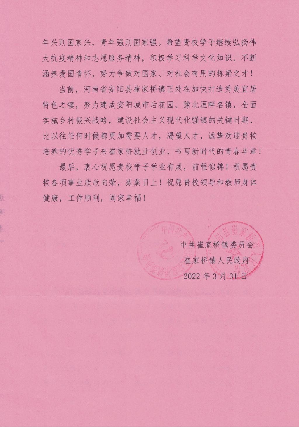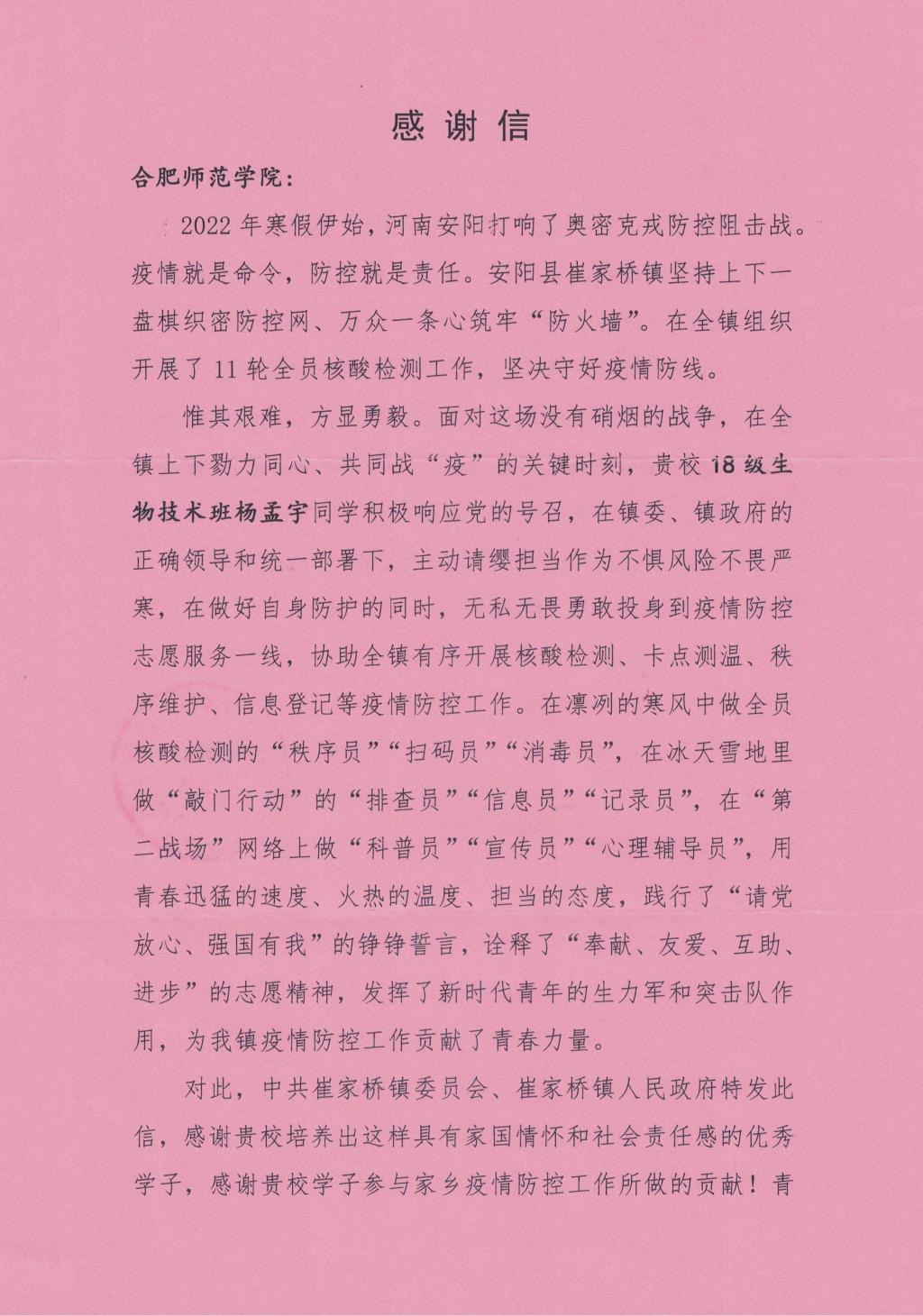 本网讯 近日,威廉体育生命科学公司收到了来自河南省安阳县崔家桥镇的感谢信。信中对18级生物技术班杨孟宇同学不畏艰险、奋勇向前,积极投身家乡的疫情防控志愿服务表达了诚挚的感谢和崇高的敬意。
