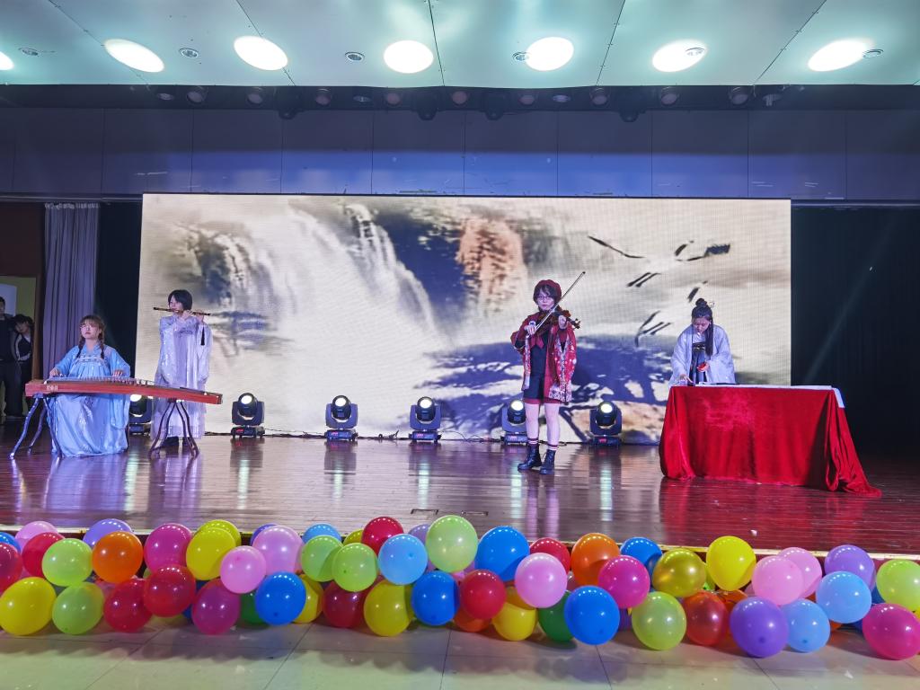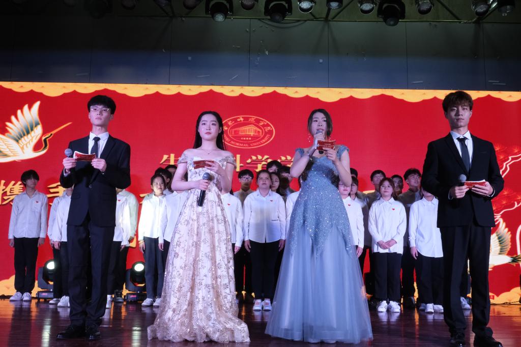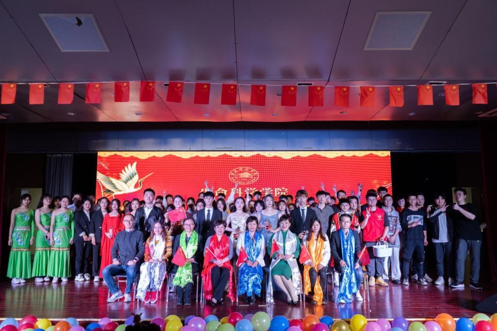 2021年是中国共产党建党100周年,历史的潮流用实力和真理告诉人们,中国共产党是人民心中最崇敬的党,节目《唱支山歌给党听》与朗诵《祖国颂》表达了同学们对中国共产党崇高的敬意和对祖国深厚的情感;一场灾难,让人疲惫不堪,但是在共产党的领导下中国人民紧紧相拥在一起,与病毒较量,小品《患难与共》再次重绘了抗疫期间的暖心故事;在白雪皑皑的天山脚下聚居着一个能歌善舞的民族,塔吉古丽·亚森和阿依谢姆古丽·努尔等同学献上的新疆舞蹈《麦西来普》和石明豪等同学演唱的《民族特色歌曲串烧》让我们身临其境,仿佛看到了他们在天山脚下生活的场景;而由赵晶晶和戚雨晨带来的相声《旅游记》用说学逗唱带我们又一次领略新疆的浩瀚沙海;十里画廊,雕梁绘栋绵延而去,廊畔河水幽碧,绿柳长堤,中国舞《牵丝戏》给观众以视觉上的冲击;节目《青瓷墨香》在书法中融入中西方乐器,传统与现代的碰撞,中西方文化的融合,更是别有一番风味在其中。晚会期间不仅有同学们的精彩表演,老师们也被作为嘉宾邀请上台演出。校团委姚瑶老师亢音高唱《这片海有我》点燃了现场的气氛;杨帆声情并茂演唱的《鸿雁》获得了同学们热烈的掌声和欢呼,歌曲结束后,杨帆带领少数民族同学一起为到场的领导老师们献上纯洁的哈达,以表达美好的祝愿。李万成与杨帆合作弹唱的《外面的世界很精彩》更是感染观众们一同参与其中;晚会在大合唱《爱我中华》的精彩演唱中完美落幕。舞台上的演出精美绝伦,舞台下挥舞着国旗的老师和同学们更是热情高涨。