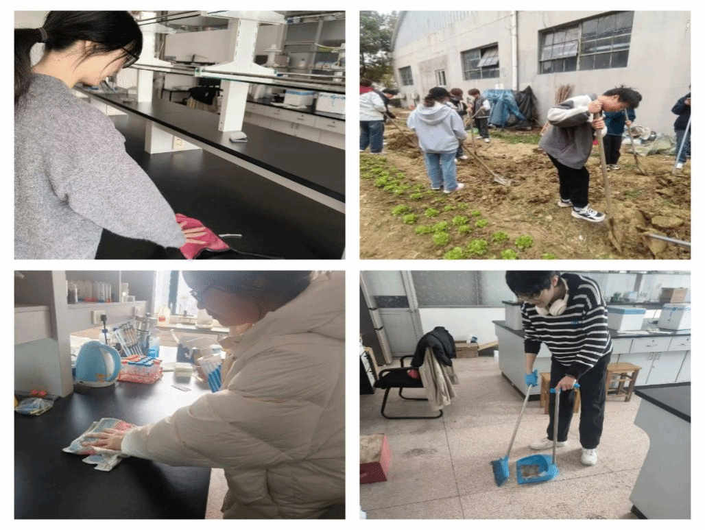 同学们投身蓝莓基地、资料室、实验室等场所进行劳动实践。在蓝莓基地中,员工党支部书记们带领同学们耕土刨地,将汗水泼洒在科技田、行知田等。在实验室、资料室和教室里,同学们认真仔细打扫地面、门窗和桌椅,清理灰尘和垃圾,整理文件资料。在校园劳动中,同学们为校园绿植刷白、修剪、施肥,他们在老师讲解下,更加深刻了解到树木对土壤、水分、光照等环境因素的需求。这些劳动实践活动展现了生物公司青年学子“不怕脏、不怕苦、不怕累”的精神品质,不仅美化了校园环境,同时也增强了集体荣誉感和责任感,感悟到良好的校园环境有利于大家的学习和生活,需要大家用心用情去维护。