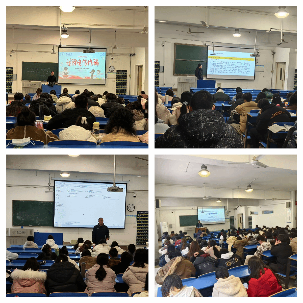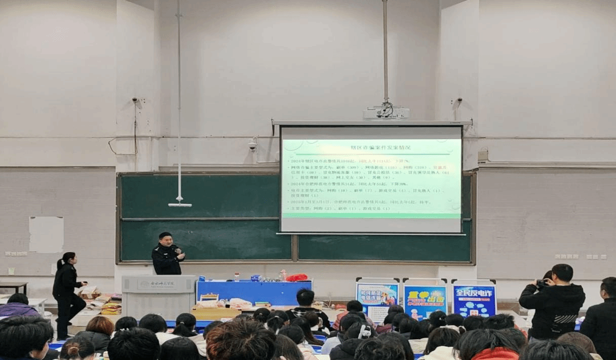 防诈安全专题宣传筑牢防火墙开学以来,辅导员在各班级均开展了一次反诈专题宣传,做到了反诈安全工作全覆盖。3月6日下午,特邀合肥市公安局锦绣派出所警官李玉成在锦绣校区逸夫楼西阶教室开展“防范电信诈骗”专题讲座,讲座由辅导员徐浩然主持,全体辅导员和200余名员工聆听了讲座。李玉成警官结合辖区发生的真实诈骗案例,通过剖析网络刷单、虚构活动中奖、网络交友诈骗、网络游戏诈骗、杀猪盘诈骗等常见的诈骗手段,详细介绍了电信网络诈骗的基本类型和防范手段,揭露了诈骗分子惯用的作案伎俩,让同学们对电信网络诈骗的各种圈套有了更加清晰的认识,进一步提高了同学们对各类电信网络诈骗的鉴别力和反诈能力。