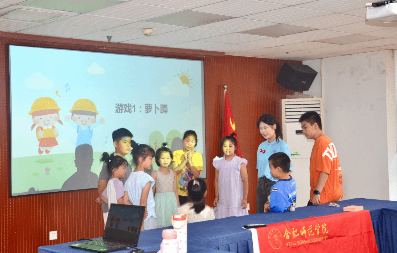 在开班仪式上,学堂负责人2024级食品质量与安全专业的宁馨同学作为主持人,介绍了行知学堂实践活动的文化背景和本学堂课程安排,随后小先生们依次自我介绍,负责人宣布“琼临行知学堂”正式启动,小学员们为小先生们戴上小红花合影留念。随后的破冰游戏环节,小学员们走上讲台自我介绍,通过三个互动性强的小游戏,小先生和小学员迅速拉近距离,现场氛围温暖而欢乐。