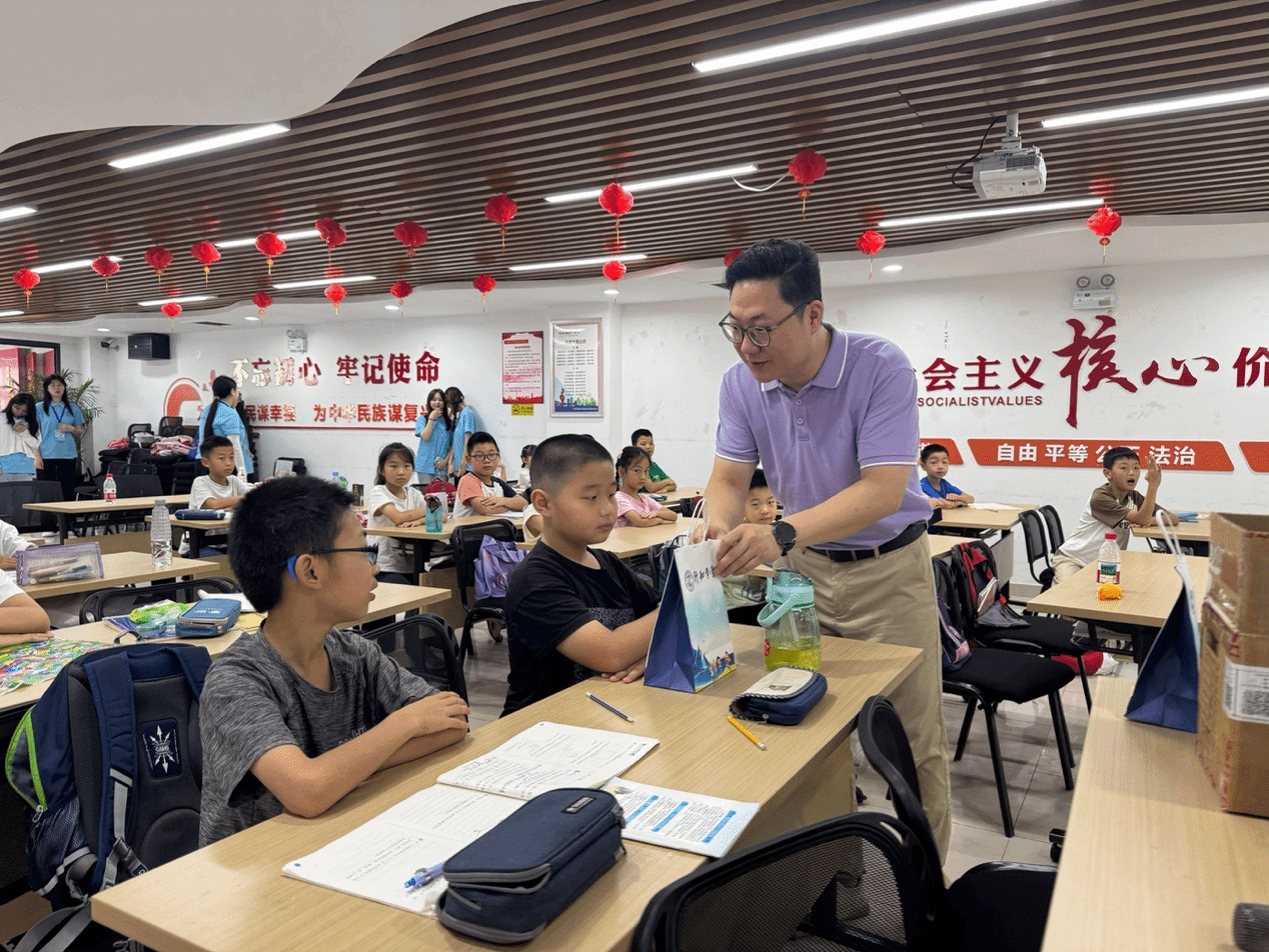 科普课结束后,马喆为每位孩子送上精心准备的"成长文具礼盒",内含印有校徽的笔记本、自动削笔刀套装和安全知识手册。马喆寄语学堂的孩子们,“希望这些文具能陪伴大家度过充实的暑假,更期待你们未来走进大公司园探索更多知识。"