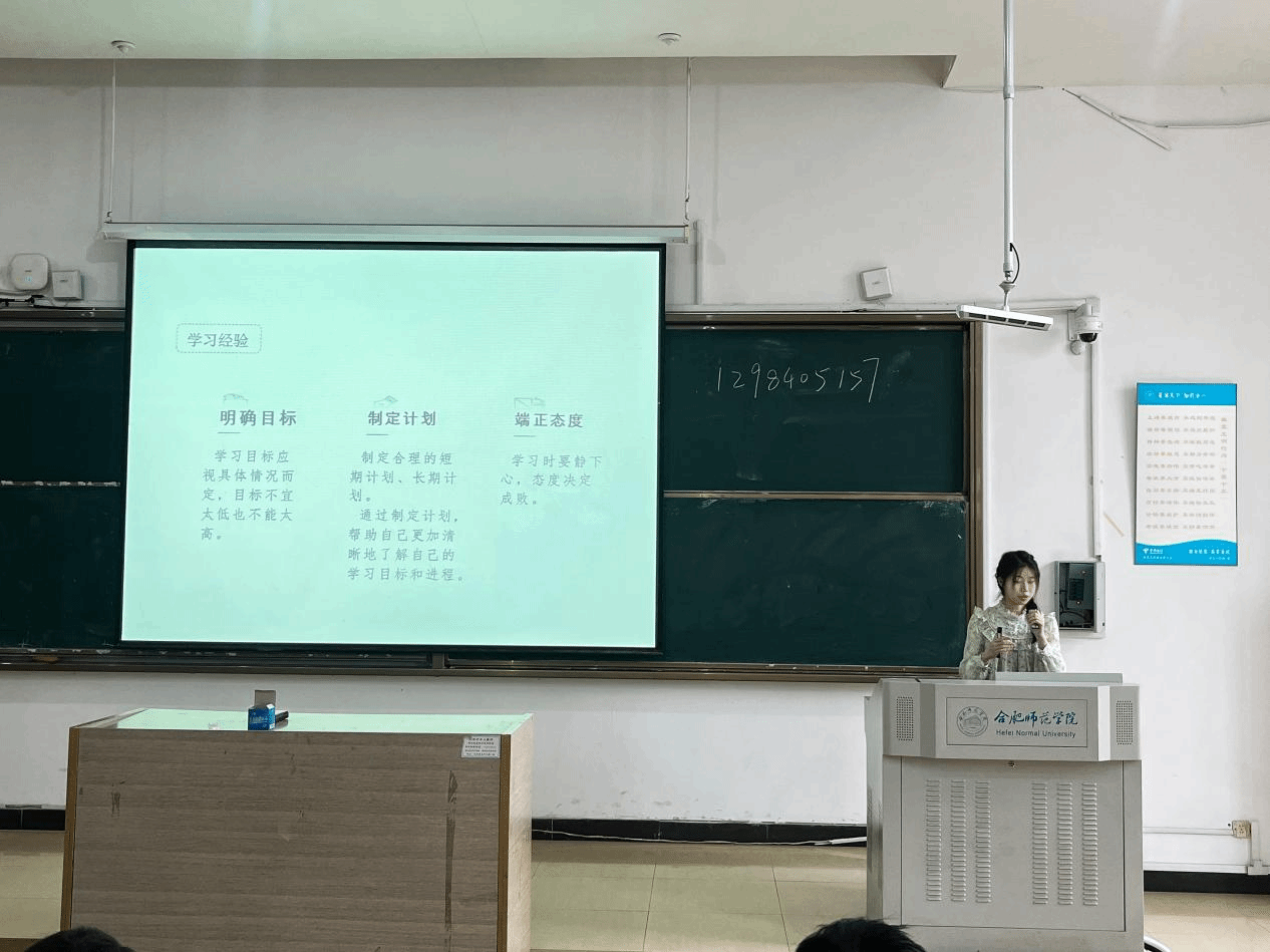金玮同学系2020级食品质量与安全专业员工,2024届安徽省优秀毕业生、国家奖学金获得者,在校期间获得多项奖项和荣誉,目前已被南京师范大学拟录取硕士研究生。金玮同学以“春风浩荡满目新,扬帆奋进正当时”为主题进行经验分享,围绕个人学习经验、竞赛活动、考研心得三个板块展开,她强调学习重在明确目标、制定计划、端正态度;对于竞赛活动要明确个人参与动机,理性看待结果,重在个人能力锻炼;在考研心得上她从考前、考中、考后三个阶段详细分享了个人经验,最后鼓励同学们不管选择那条路,都要勇往直前,不负青春。