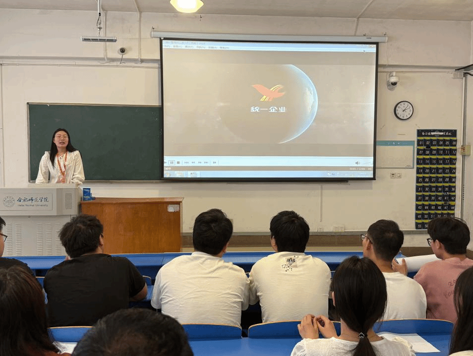 招聘会伊始,合肥统一企业周润霞向同学们播放了企业宣传片,展示公司的发展历程、企业文化、产业布局以及未来发展规划。随后,经理田远路向同学们详细介绍了公司的经营理念、岗位体系和职业生涯规划。