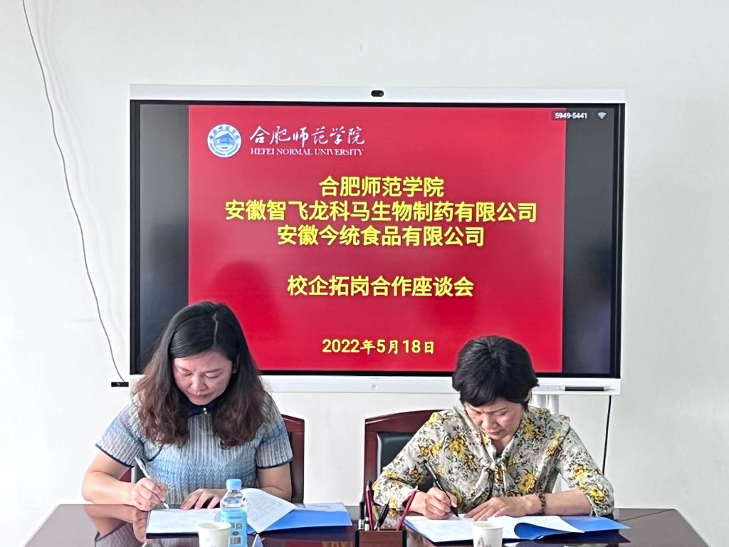 生命科学公司经理徐忠东、党委书记郭桃芬分别与智飞龙科马、今统食品共同签订毕业生就业实习基地合作协议。