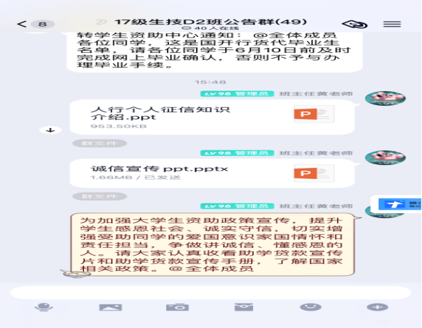 2.观看影片及发放宣传手册。将助学贷款宣传片、宣传手册ppt线上发放给员工,让员工更加熟悉贷款流程。通过《人行个人征信知识介绍》、《2020年诚信宣传》PPT等宣讲材料,向员工宣讲诚信和金融知识,普及征信及信用知识,以案例的形式向员工解读诚信感恩的重要性,进一步增强员工诚信意识。