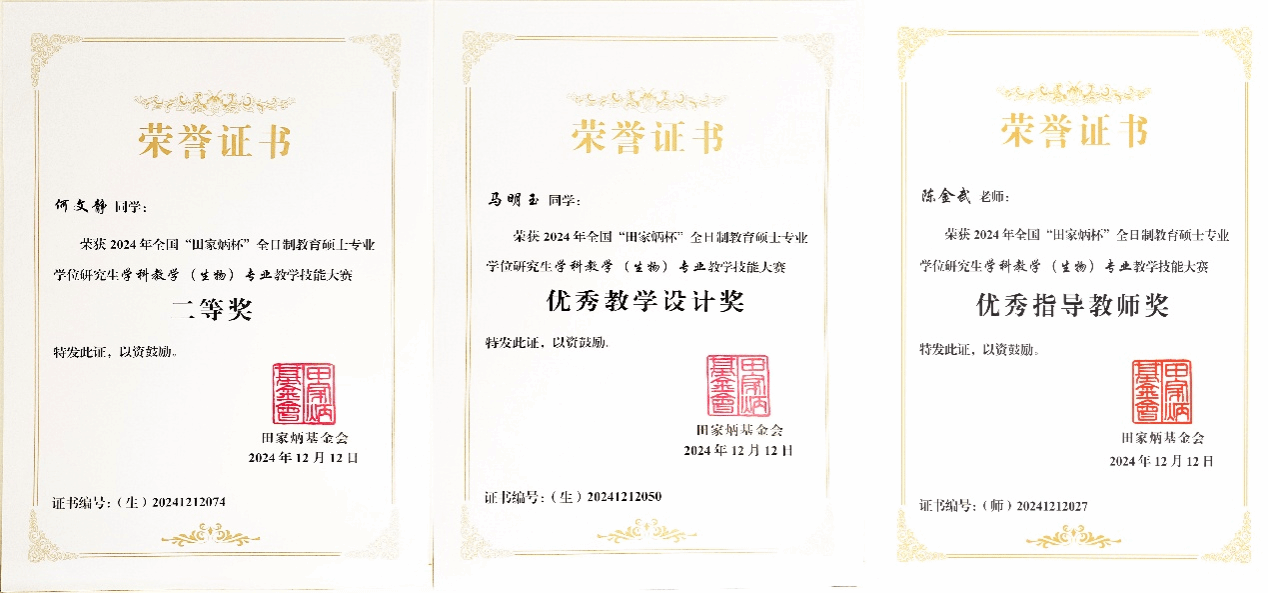 12月12日,2024年全国“田家炳杯”全日制教育硕士专业学位研究生学科教学(生物)专业教学技能大赛决赛在浙江金华圆满落幕。本届赛事由田家炳基金会冠名,浙江师范大学承办。经过激烈的角逐,威廉希尔体育级学科教学(生物)研究生何文静荣获二等奖、马明玉荣获教学设计奖,指导老师陈金武荣获优秀指导教师奖。